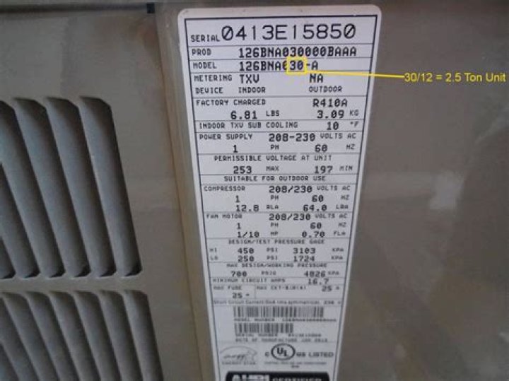 Find the model number. Within this string of letters and numerals, you should find an even, two-digit number. The possibilities on residential units range from 18 to 60. Divide the number by 12 (which represents 12,000 Btu/hr, or one ton of cooling capacity) to get your AC unit’s tonnage.